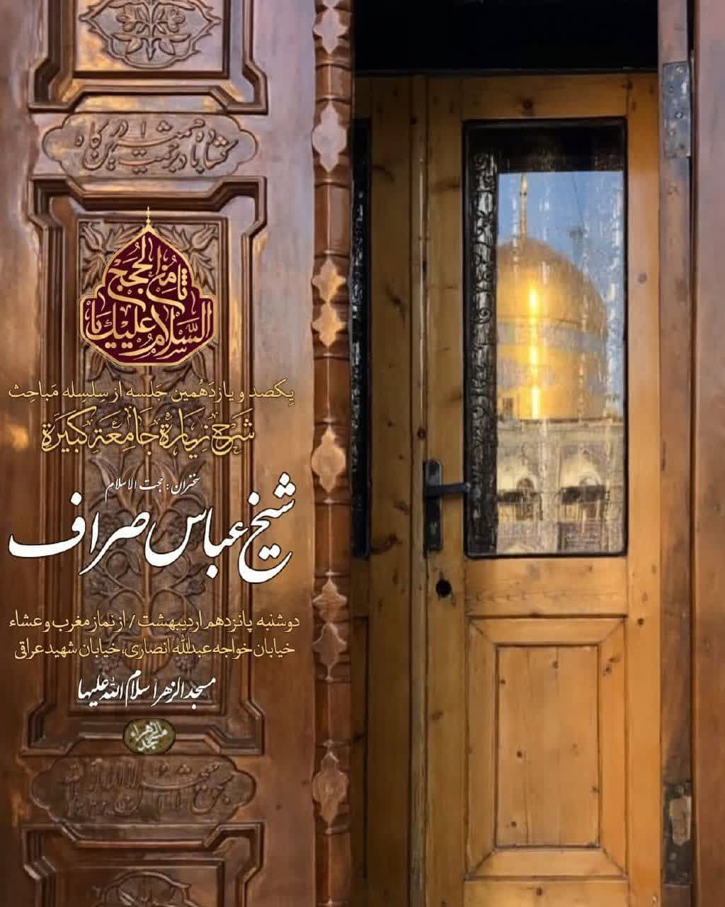 📢 سلسله جلسات هفتگی #شرح_زیارت_جامعه_کبیره 🎙 شیخ عباس صراف 📆 دوشنبه ۱۵ اردیبهشتماه 🕖 از اذان مغرب 🔰 مسجدالزهرا(س) – هیئت فاطمیون